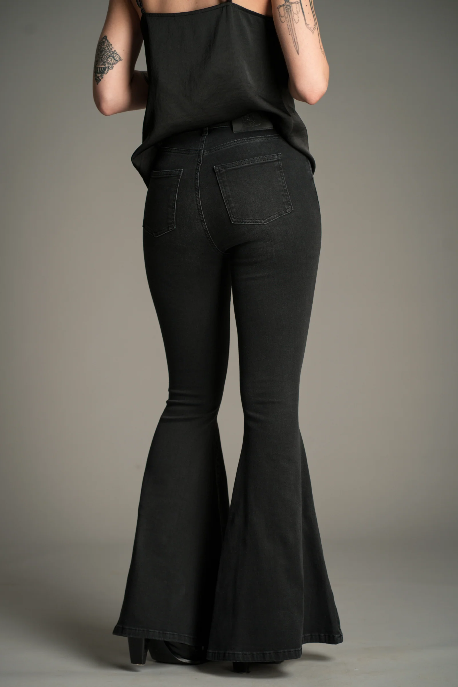 Cut from soft-touch stretch denim in a vintage-wash black, they sit high on the waist and hug every curve before kicking out into that perfect retro bell-bottom flare. Finished with our signature skull patch at the waistband, a nod to the rock ‘n roll soul in every pair.